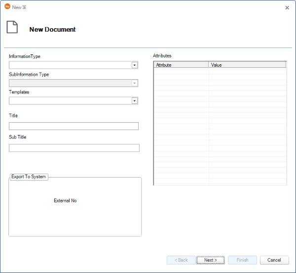 • Title: Input a title for your document. Must be specified. If you end your input by pressing Enter you are done and the "New document window" will close. If not press Tab to move to next field or use the mouse.